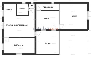 Az első házrészben két szoba és egy wc-vel ellátott fürdőszoba található. A kert felőli rész amerikai konyhás nappaliból, hálószobából, fürdőszobából és kézmosóval ellátott wc-ből áll.