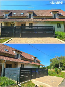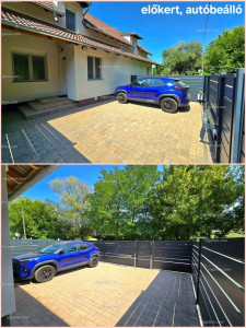 Az előkert autóbeállónak lett kialakítva, ahol két személyautó fér el. Ez a rész (és a terasz) térkővel van fedve, valamint alumínium léckerítés övezi, kis- és nagykapu kialakítással. A nagykapu 5 m széles és automata (távirányítóval működtethető).