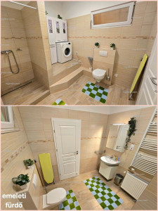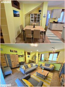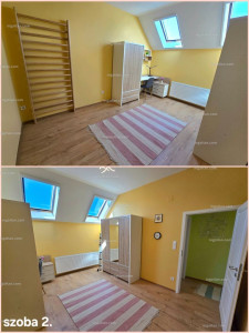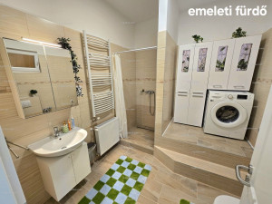 A lakás 2 szintes. Alsó szinten előtér, kazánház (ami egyben vendég mosdó is), fürdő, amerikai konyhás nappali és étkező került kialakításra, míg a felső szinten 3 szoba és egy fürdő. A nappalihoz csatlakozik egy 24 m2-es fedett terasz, amely az 563 m2-es hátsó kertre néz. A tetőtéri felső emelet teljes mértékben hasznos terület, mert a tető dőlése csak 197 cm után kezdődik. Alsó szinten a belmagasság 2,8 m és a felső szinten 3 m. Bőven van mindenhol légtér és élettér.