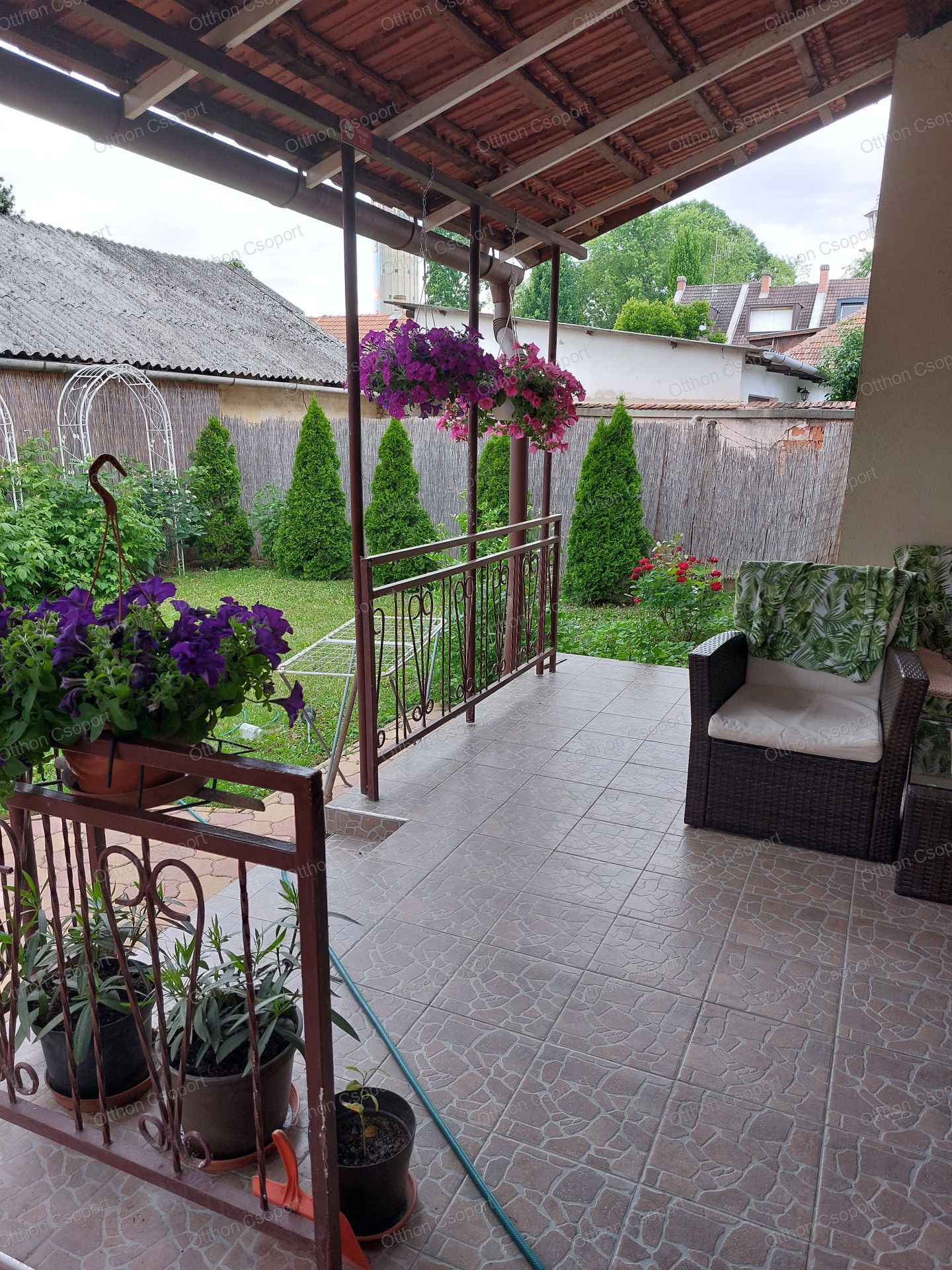 A hátsó kert zöld, intim és csendes, ideális hely pihenésre, grillezésre, vagy akár egy kis konyhakert kialakítására.