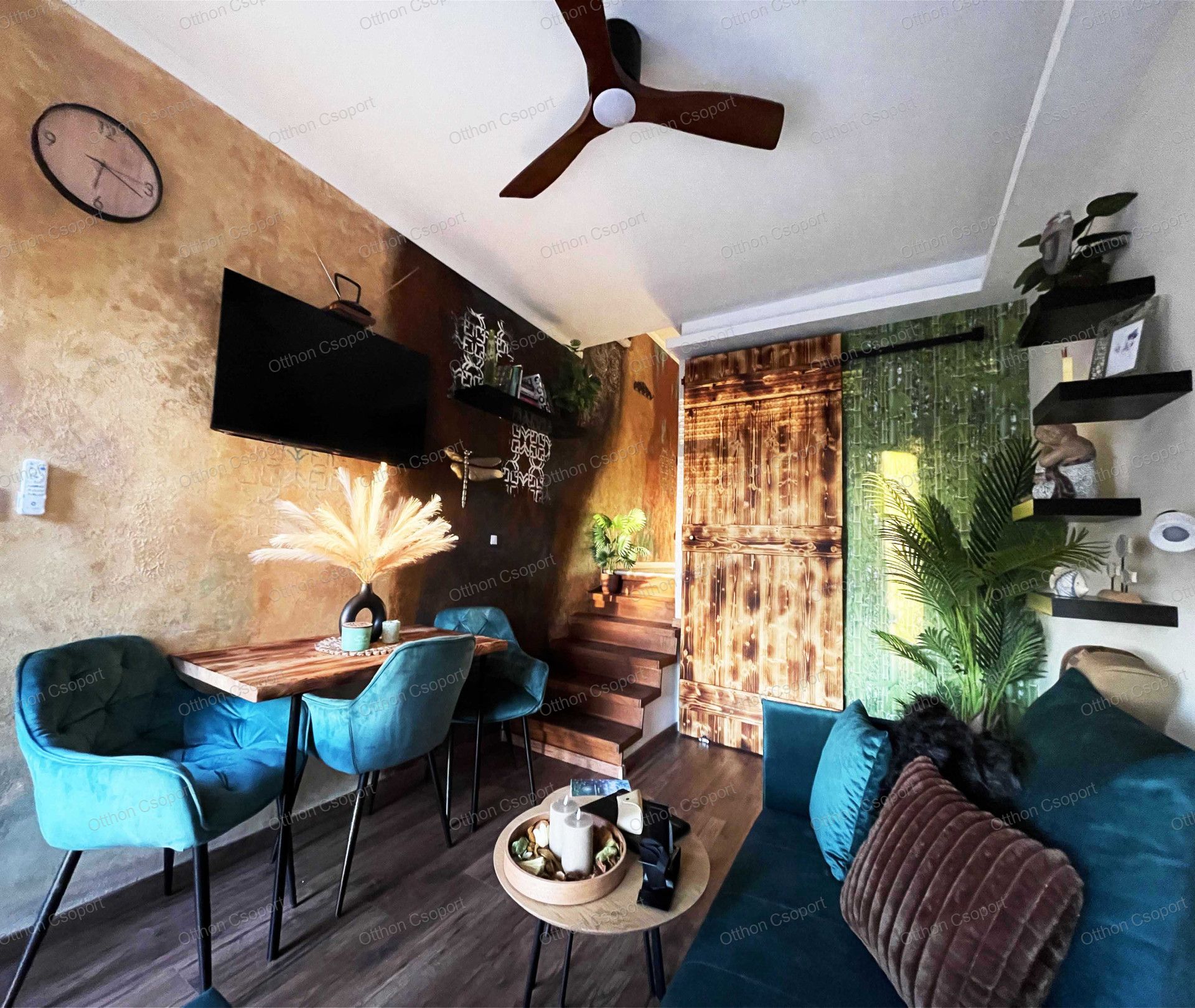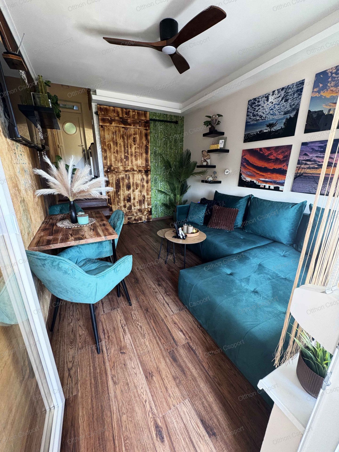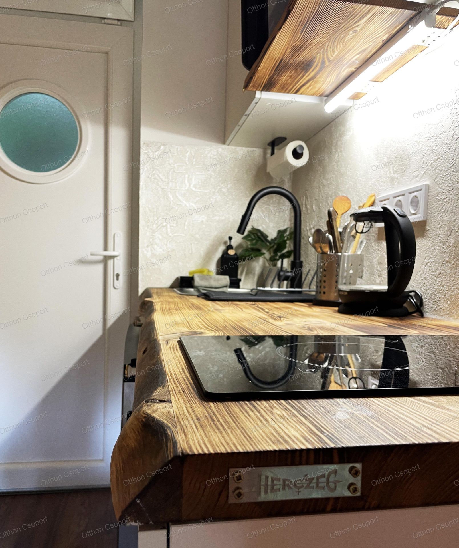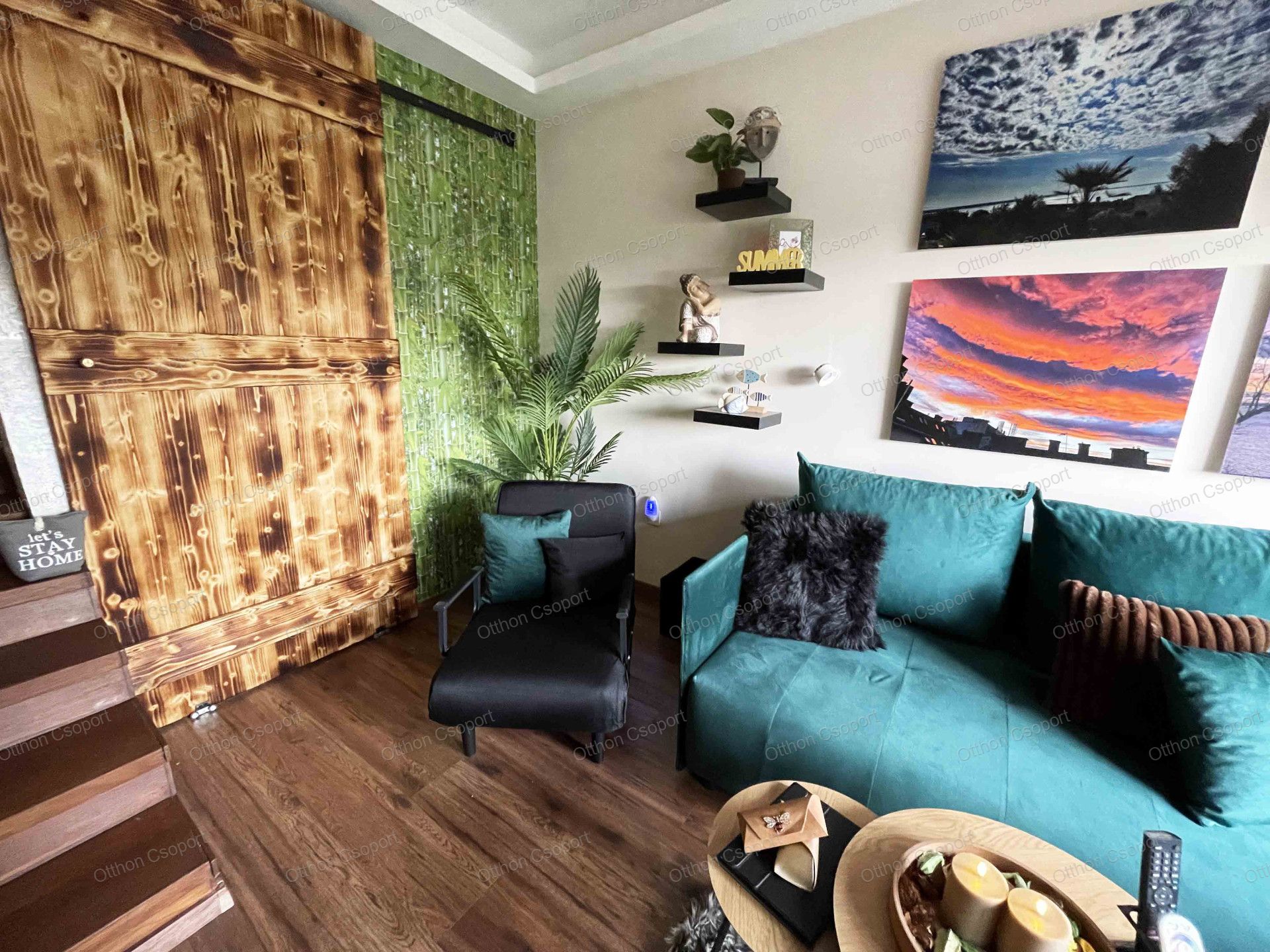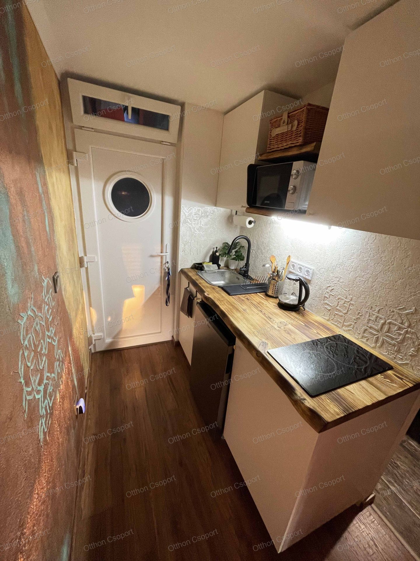 Egyedi tervezésű, prémium design-apartman eladó Balatonalmádi Káptalanfüred részén társasüdülőben, a teraszról balatoni panorámával, gondozott, közös használatú kerttel, napozóval, grillezővel, kiülővel, közúton 600 méterre a hangulatos, családias Káptalanfüred strandtól, gyalog se több néhány percnél. Saját, zárható, árnyékolt kocsibeállóval, parkolóval közvetlenül a ház mellett (amely részét képezi az adásvételnek). Műszakilag tökéletesen felújított és tervező által megdizájnolt állapotban, tehát teljesen új elektromos és vízhálózattal, teljes felületén elektromos fűtőszálas padlófűtéssel, szobatermosztáttal. Dél-keleti tájolású, szépen árnyékolt, földszinti nyaraló, a teraszról kijárással a gyönyörű kertre, melyet kertész gondoz. Alapterülete 25,3 m2, egy nappali/háló kihúzható kanapéval, + egy vendég-fotelágy, 3 személy részére kényelmes alvási lehetőséggel, ill. 3 személyre szabott ebédlőasztallal, tágas gardróbbal. Teljeskörűen berendezett, új konyha rész új háztartási gépekkel, önálló fürdőszoba tusolóval, wc-vel, 50 literes bojlerrel. Terasz 5 m2, 2+2 személy számára kiülési lehetőséggel, balatoni panorámával. A legtöbb bútor, ill. berendezés egyedileg tervezve és gyártva borovi fenyőből a lehető legoptimálisabb helykihasználással. Csodás panoráma nyílik bentről is a nappaliból a Balatonra a hatalmas üvegfelületen keresztül. Az árban foglaltatik az összes berendezési tárgy és bútor okostévével, hűtőszekrénnyel, mosógéppel, dísztárgyakkal, mindennel együtt. Kiadásra, szállásoltásra, turizmusra remek megtérülésű befektetésként, avagy saját használatra pihenésre, töltődésre, kikapcsolódásra egyaránt kitűnő lehetőség. Ára: 49 M Ft. 06209730443 Igény esetén örömmel megmutatom személyesen, hívjon bátran.